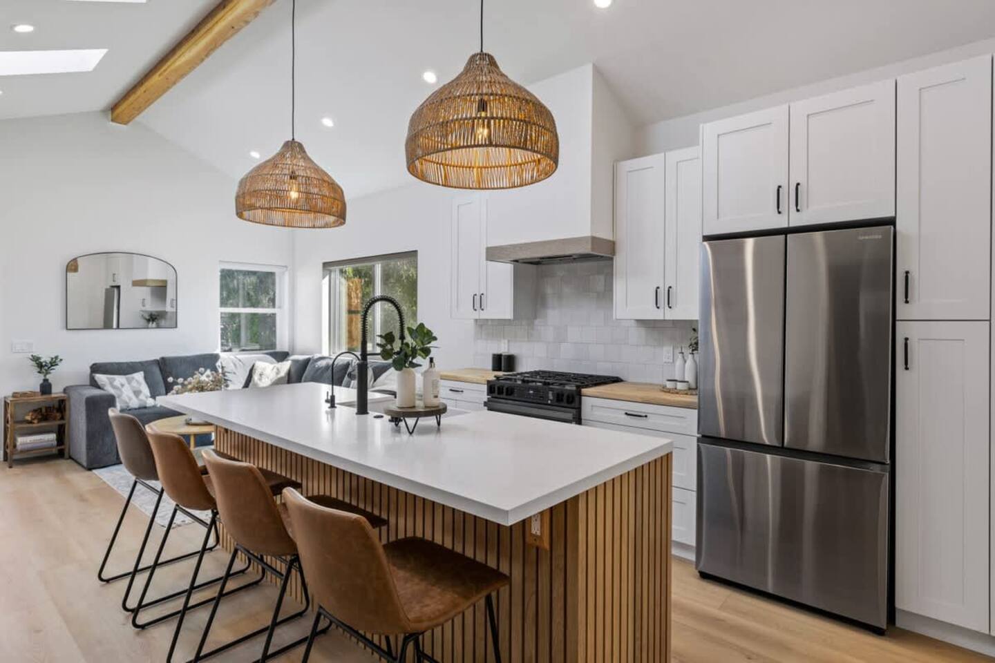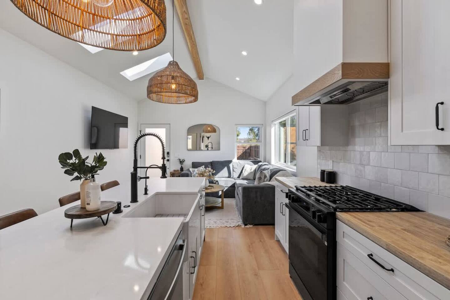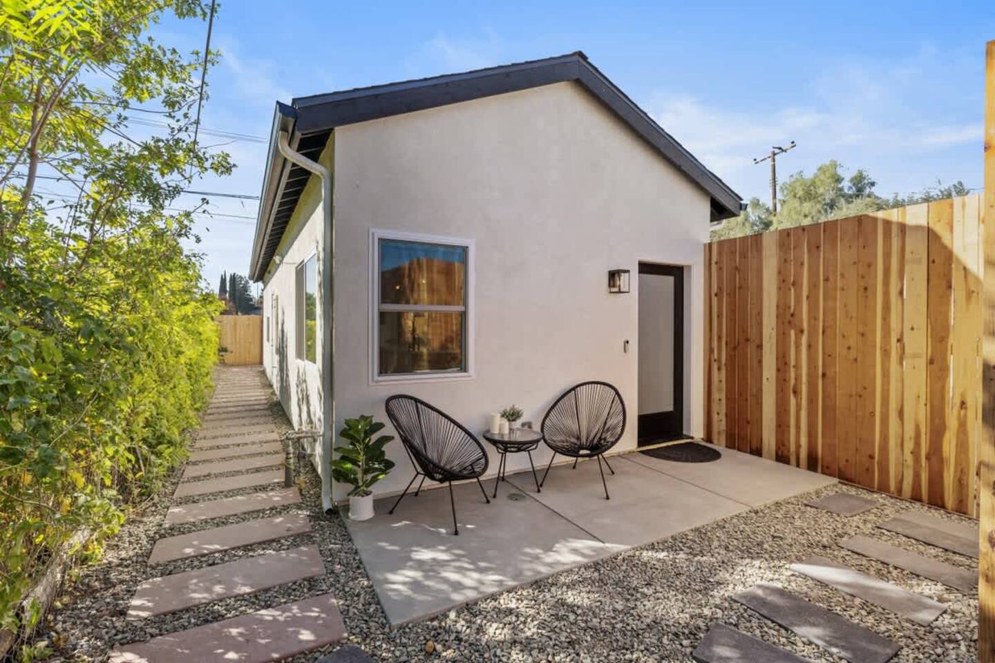 Welcome to our stunning, newly built 2-bedroom, 1-bath ADU in Thousand Oaks! Completed in late 2024, this modern and thoughtfully designed guest house offers a perfect combination of comfort, style, and convenience. Nestled in a quiet, family-friendly neighborhood with a private entrance and beautifully landscaped outdoor spaces, this property is ideal for guests seeking a peaceful retreat. Interior Features: Step inside to discover a bright and airy open-concept living space featuring vaulted ceilings and large windows that let in natural light. The modern living area boasts a spacious L-shaped sofa, perfect for relaxing or streaming your favorite shows on the 65-inch Roku smart TV. Both bedrooms also feature 50-inch Roku TVs, allowing everyone to enjoy their favorite entertainment. The kitchen is equipped with high-end appliances, sleek countertops, and a breakfast bar with seating for four—great for dining or remote work. Each bedroom is tastefully decorated with cozy bedding, ample closet space, and serene views of the private yard. The bathroom features contemporary fixtures, a walk-in shower with designer tile, and plush towels to elevate your stay. Outdoor Space: Enjoy your private outdoor oasis, complete with a dining area for four, a cozy gas firepit with additional seating, and stylish string lights creating a warm ambiance. Perfect for morning coffee or evening relaxation, this space is thoughtfully designed to let you make the most of California’s sunny weather. Convenient Location: Located on Westminster Street, Thousand Oaks, this property provides easy access to local attractions, dining, and shopping. We’re within walking distance of Tarantula Hill Brewing Company, a popular local spot for craft beer and casual bites, as well as favorite breakfast spots like Eggs ’N’ Things. The home is also a short drive to Malibu, Los Angeles, and Santa Barbara, making it a fantastic base for exploring the area. Perfect for Any Stay: Whether you’re planning a short getaway or a long-term stay, this property is equipped to meet your needs. Enjoy a peaceful retreat for a weekend escape, or take advantage of the fully equipped kitchen, washer, and dryer for an extended visit. This ADU is thoughtfully designed to ensure you feel right at home no matter the length of your stay. Highlights: • Newly built property, completed in late 2024 • 2 bedrooms with comfortable beds and stylish decor • 1 modern bathroom with a walk-in shower • Fully equipped kitchen with high-end appliances • L-shaped sofa and a 65-inch Roku TV in the living room • Two bedrooms, each with a 50-inch Roku TV • Private outdoor space with firepit, dining area, and string lights • Dedicated washer and dryer for guest use • Walking distance to Tarantula Hill Brewing and popular breakfast spots like Eggs ’N’ Things • Secure smart lock entry and exterior cameras for safety This newly built ADU combines modern luxury with a homey touch, offering an unforgettable stay in Thousand Oaks. Whether you’re here for business, leisure, a weekend trip, or an extended stay, you’ll find everything you need to feel at home!